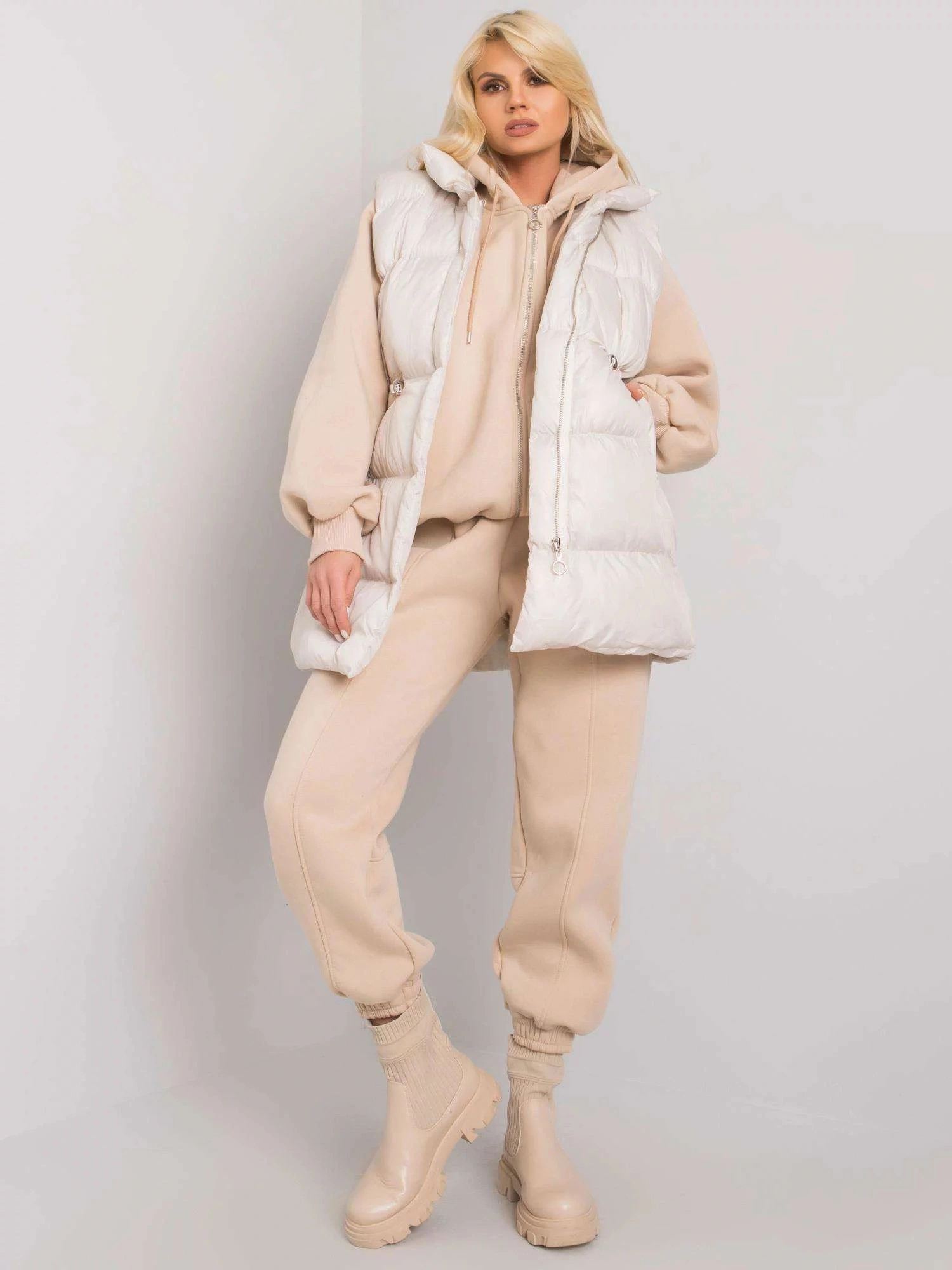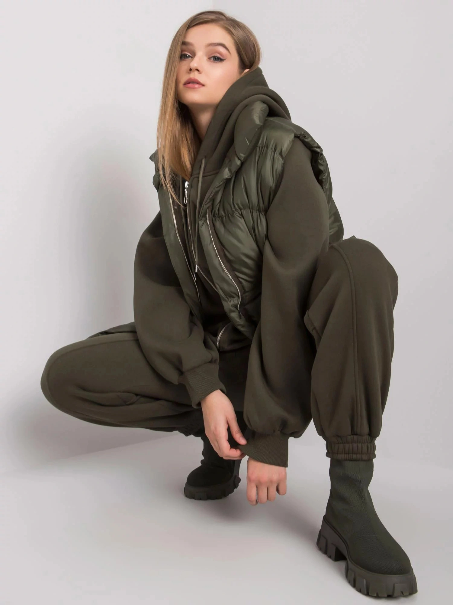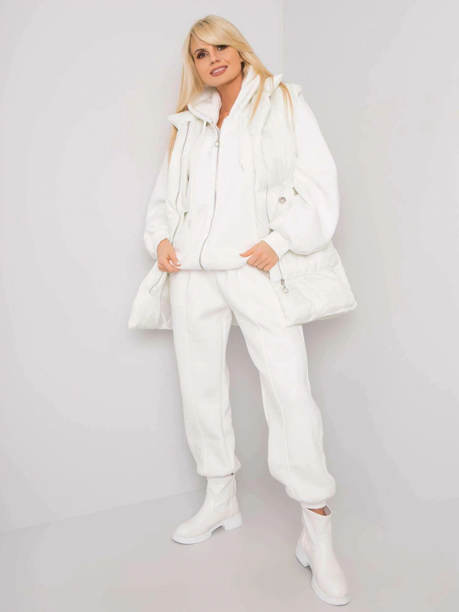 Zestaw zawiera: bluzę z kapturem, spodnie dresowe, kamizelkę puchową.