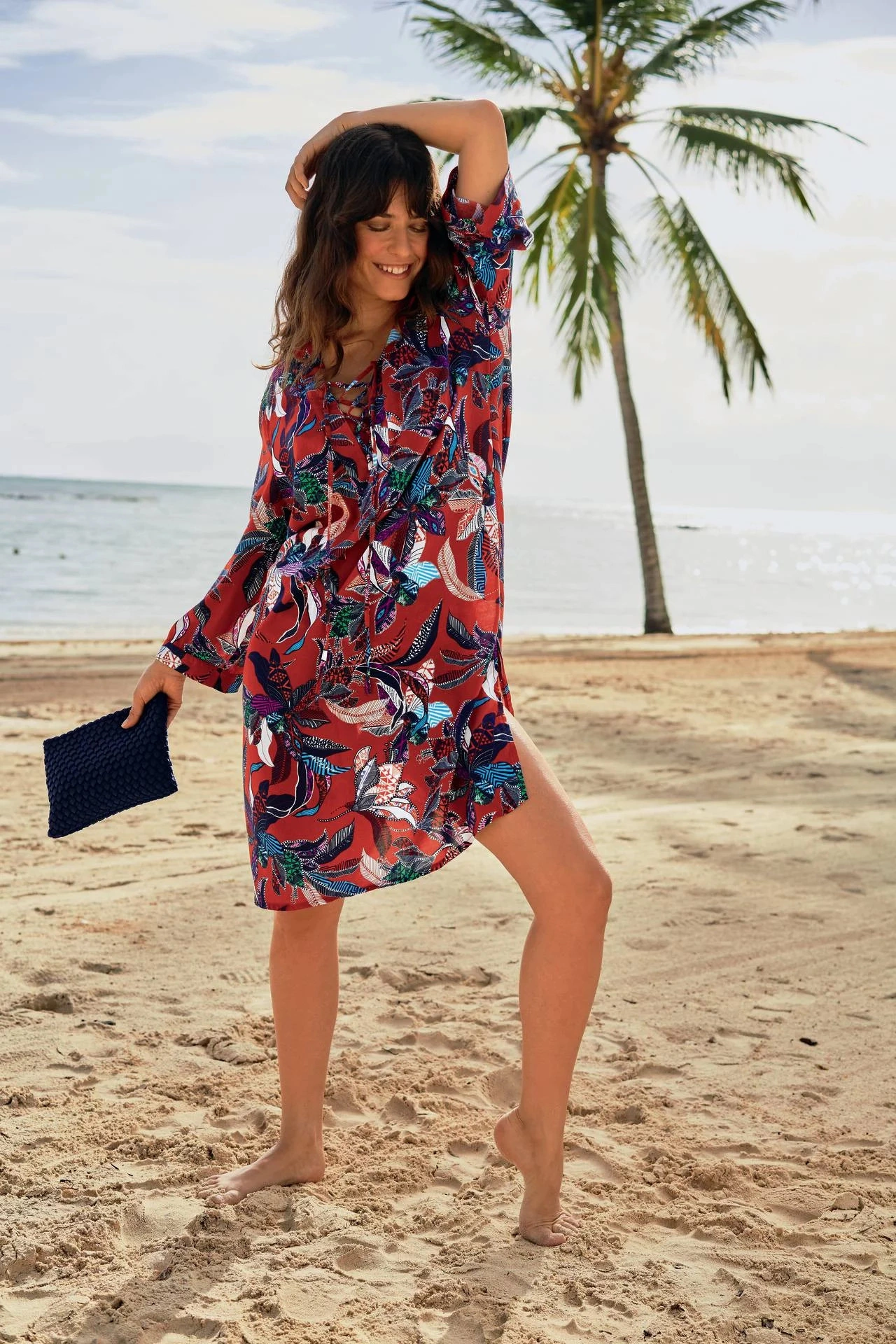 Idealna na następną wycieczkę na plażę: nieprzezroczysta tunika Lucena z odważnym indiańskim nadrukiem z serii "Indian Life". Miękki, lejący materiał zapewnia wygodne dopasowanie, a boczne otwory wentylacyjne i szerokie rękawy ¾ zapewniają dużą swobodę ruchów. Urocze sznurowanie na dekolcie doskonale podkreśla dekolt.