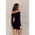 Wyjątkowa mini sukienka, która z pewnością przyciągnie wzrok przy każdej okazji. Sukienka posiada szeroki dekolt przechodzący w odkryte ramiona z długimi rękawami. Sukienka posiada ozdobne marszczenia z przodu i częściowo na plecach. Sukienka wykonana jest z materiału z brokatem. Ten model sukienki to doskonały wybór jako kompletny strój, który idealnie sprawdzi się na różnego rodzaju uroczystości. Produkt wykonany i uszyty w Polsce.
