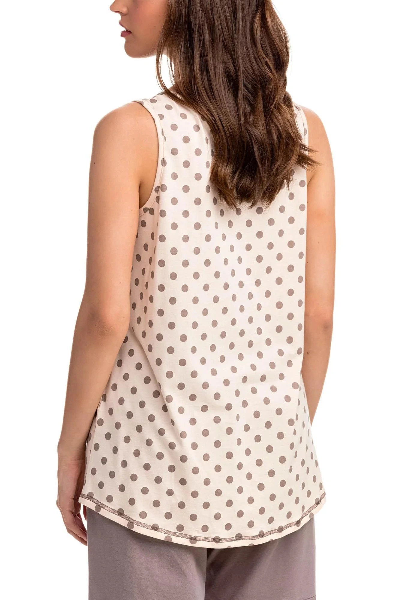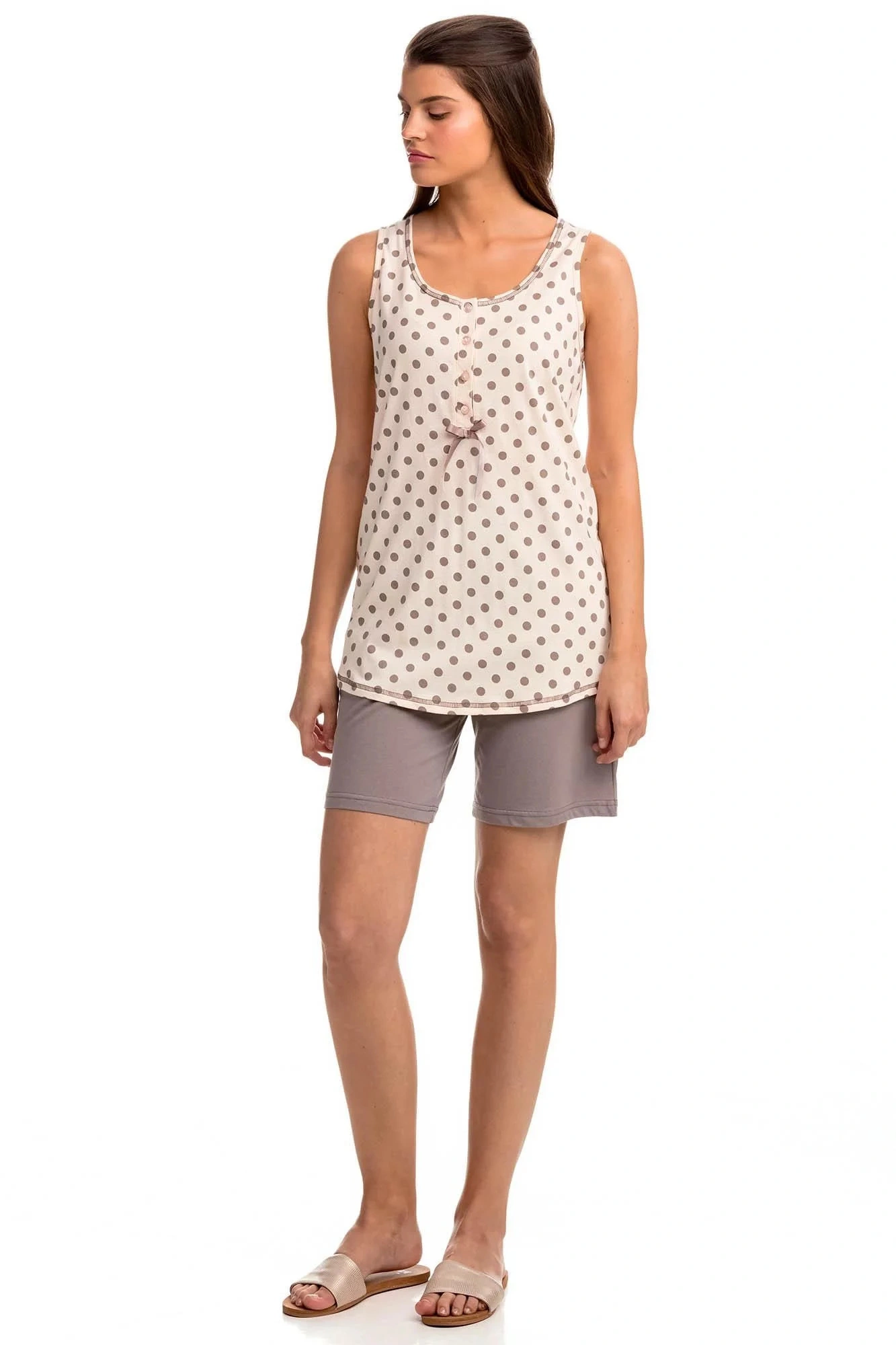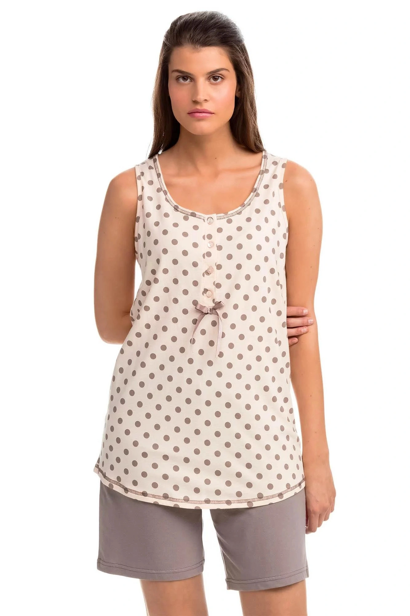 Wygodna dwuczęściowa piżama do słodkiego snu i pięknych chwil. Zestaw składa się z koszulki z wzorem w kropki, uzupełnionej monochromatycznymi szortami. Ta piżama damska jest wykonana z wysokiej jakości, niemodyfikowanej genetycznie 100% naturalnej greckiej bawełny, która zapewnia wysoki komfort, miękkość w dotyku, oddychalność i trwałość.