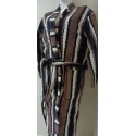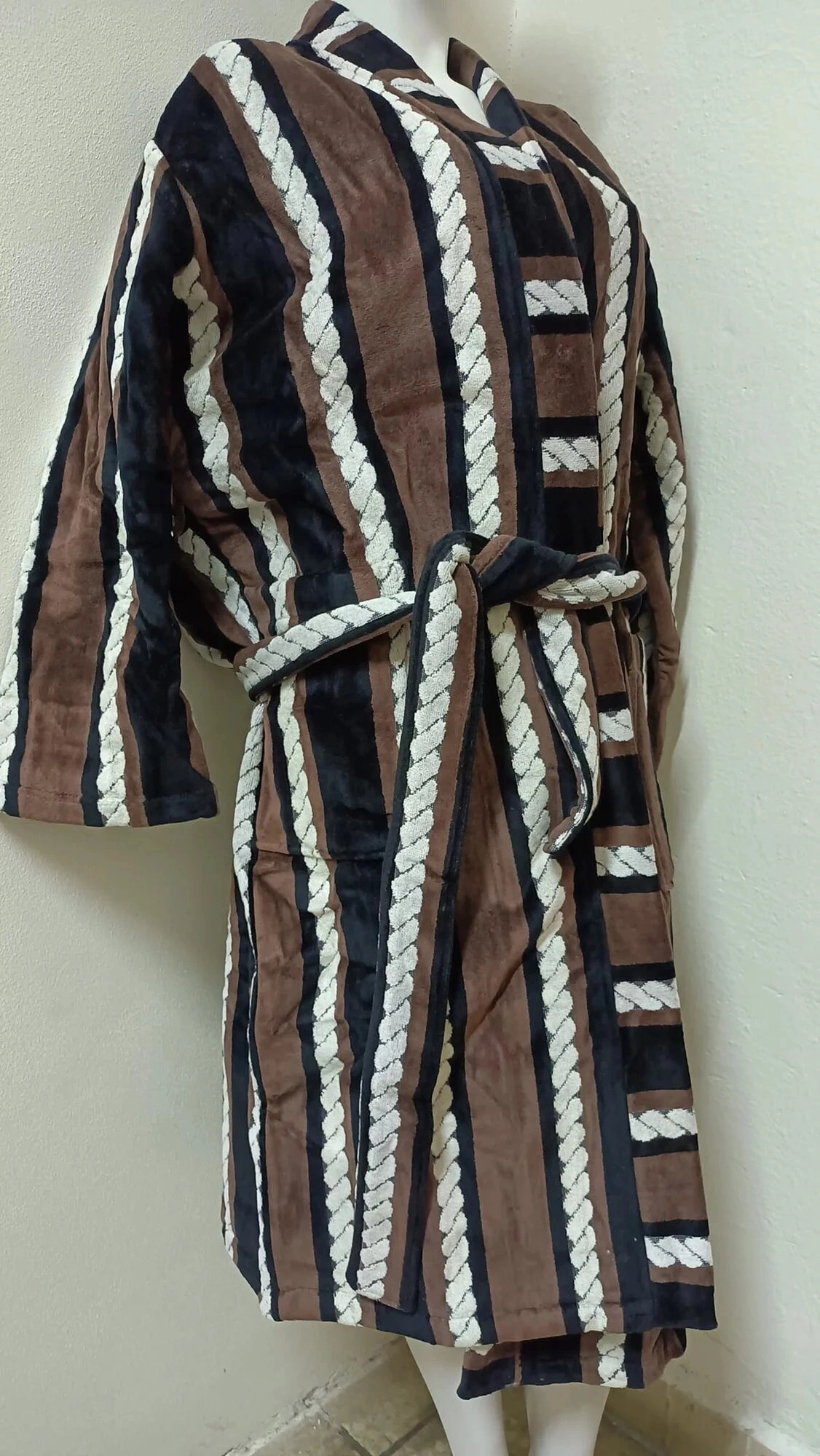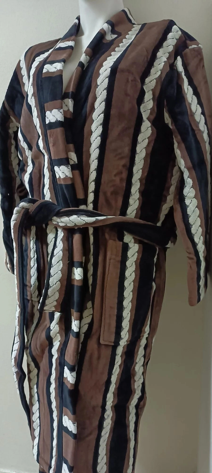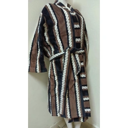 Męski długi szlafrok z szalowym kołnierzem, z ciekawym czarno-biało-brązowym nadrukiem.