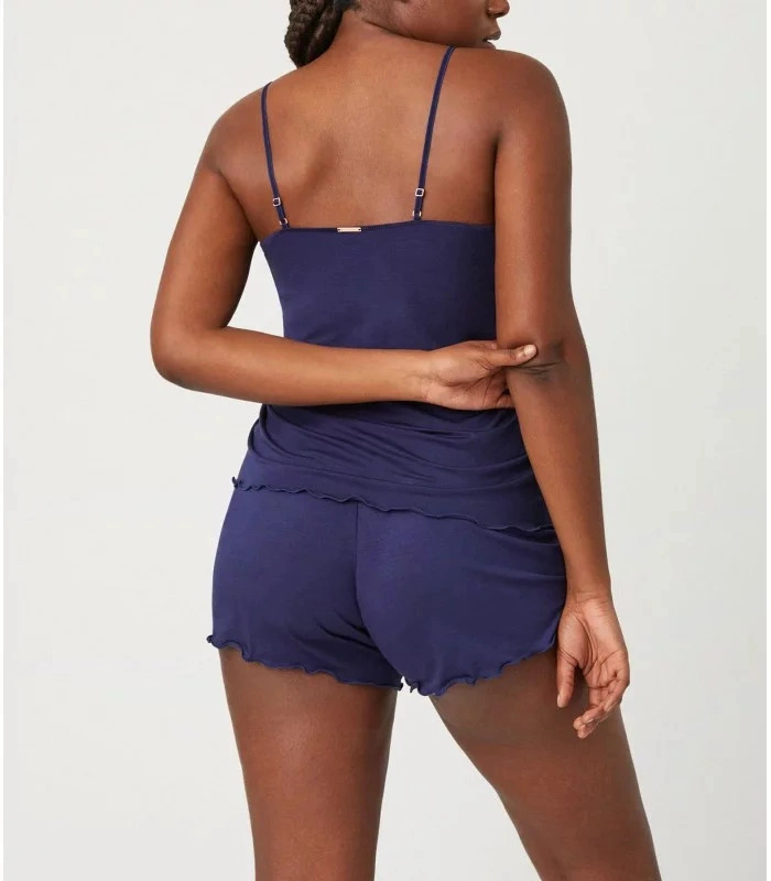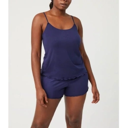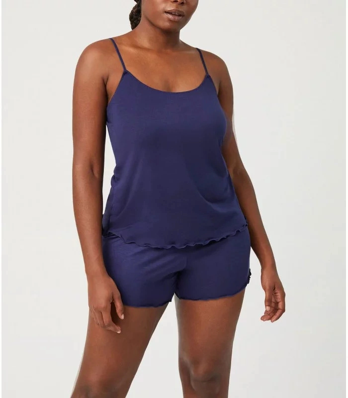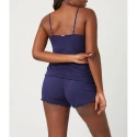 Damski zestaw koszulki i spodenek. Krótka koszulka z przesuwanymi ramiączkami. Szorty z szerokim elastycznym pasem.
